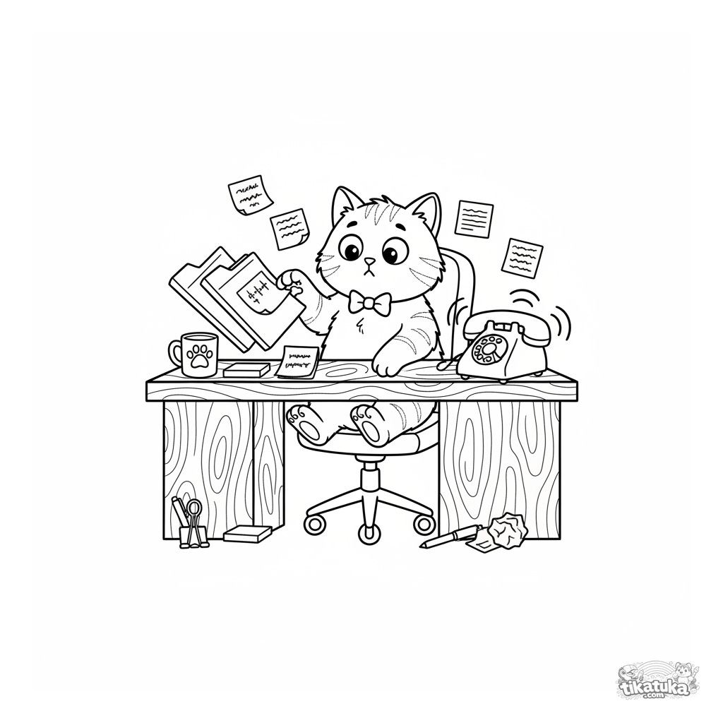 Ausmalbild für Kinder 7-12: Eine verwirrte Katze mit Krawatte sitzt auf einem Bürostuhl und starrt gestapelte Ordner und ein klingelndes Telefon an. Lustige Arbeitsplatz-Chaos-Szene.