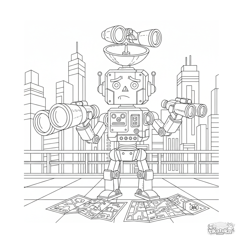 Ausmalbild für Kinder 10-12: ein verwirrter Roboter auf einer Aussichtsplattform versucht, drei Ferngläser gleichzeitig zu benutzen, um das Gehalt zu suchen. Technisches Meme mit Details.