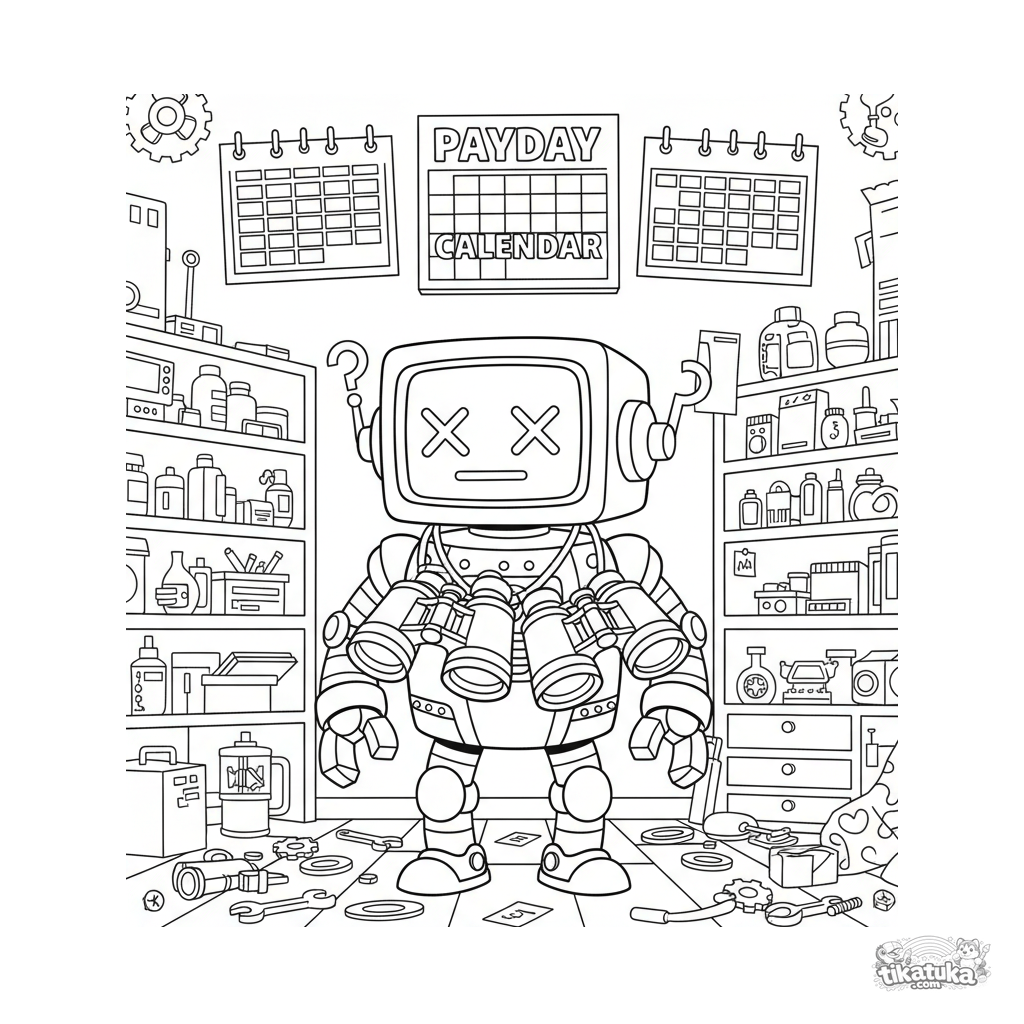 Ausmalbild für Kinder 10-12: Ein verwirrter Roboter in einer Werkstatt, der in mehreren Ferngläsern verstrickt ist und auf Kalender starrt. Komplexe lustige Szene mit Details.