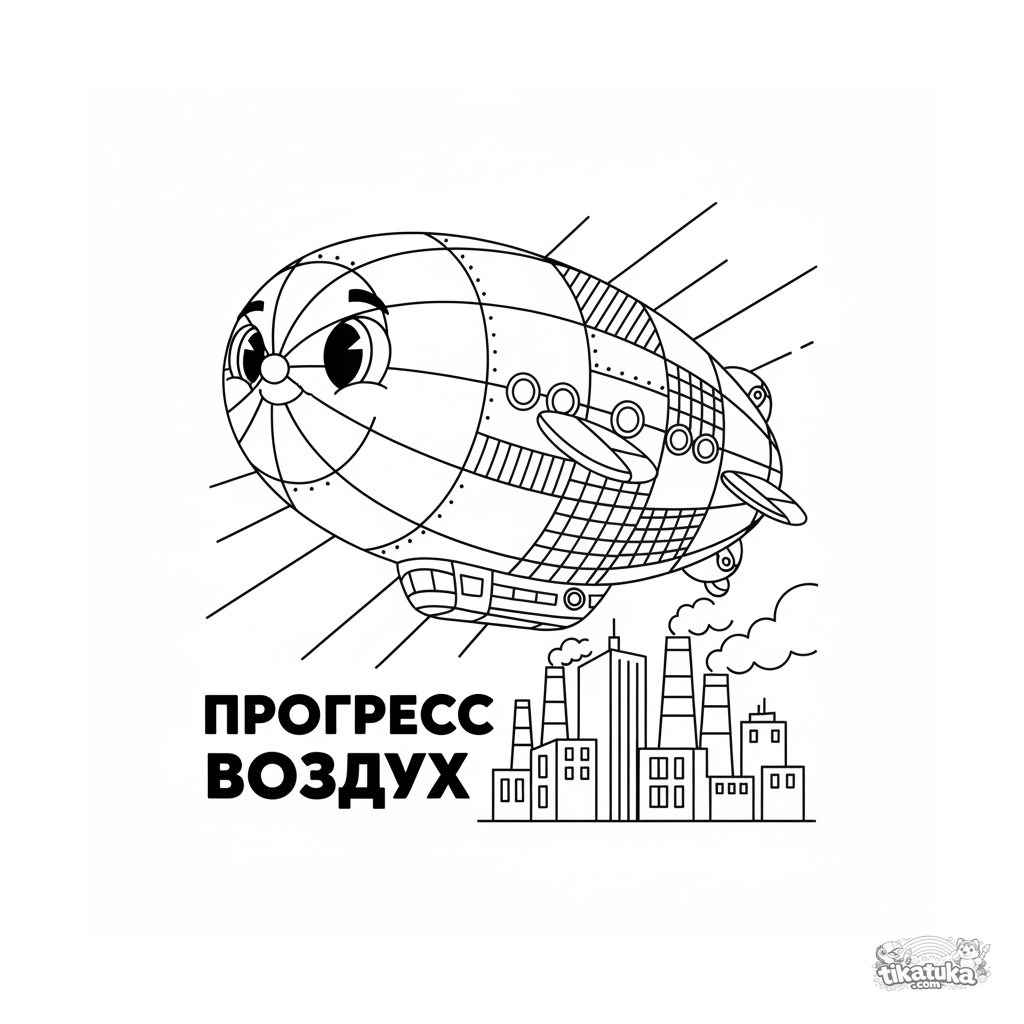 Stylisiertes Ausmalbild im Stil eines konstruktivistischen Plakats der 1930er Jahre: ein geometrisches Starrluftschiff fliegt über einer Stadt. Für Kinder von 10-12 Jahren.