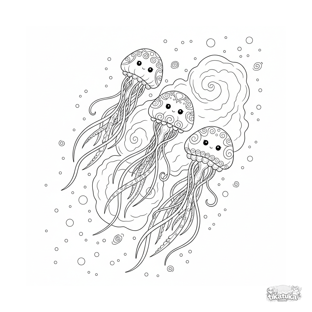 Ausmalbild für 10-12 Jahre: Anmutige Alien-Kreaturen, die Quallen ähneln, treiben durch einen Nebel im Weltraum. Komplexe, fließende Linien im Art-Nouveau-lite-Stil.