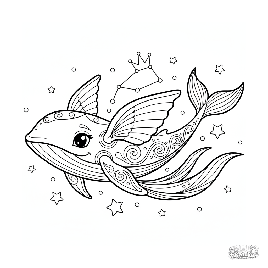 Detailliertes Ausmalbild für 10-12 Jahre: Ein majestätischer kosmischer Wal mit Körpermustern schwimmt durch ein Sternenfeld und ein Sternbild. Fließende, künstlerische Linien.