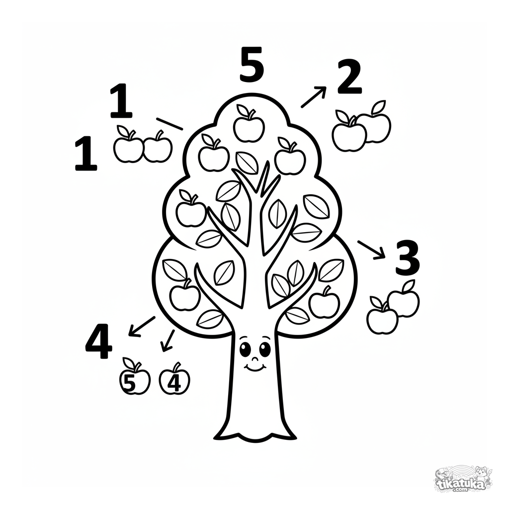 Ein pädagogisches Ausmalbild für Kleinkinder von 2-3 Jahren. Ein Apfelbaum mit Äpfeln und Zahlen 1 bis 5 hilft beim Zählen lernen. Einfache Formen.
