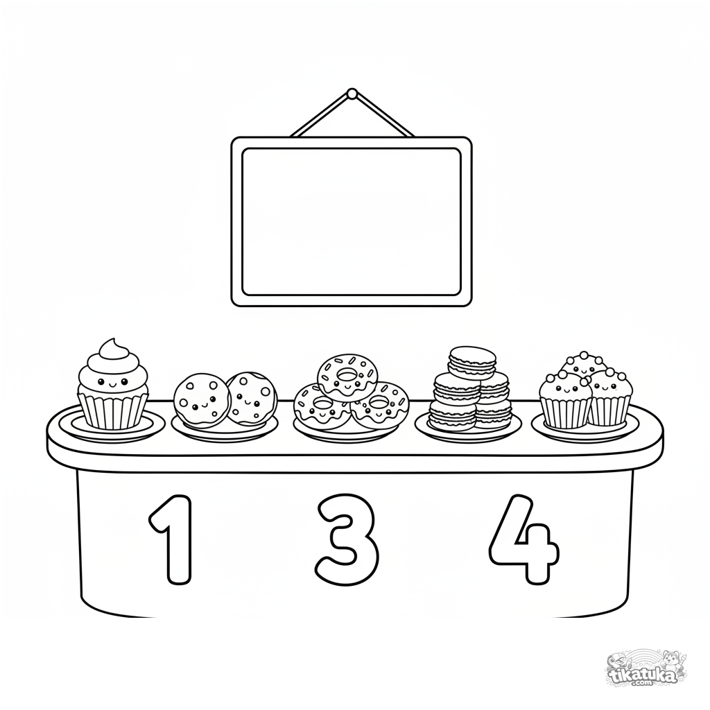 Pädagogisches Ausmalbild für Kinder 2-4: Zähle von eins bis fünf mit fröhlichen Gebäckgesichtern an einer Bäckertheke. Perfekt für frühe Mathestunden.