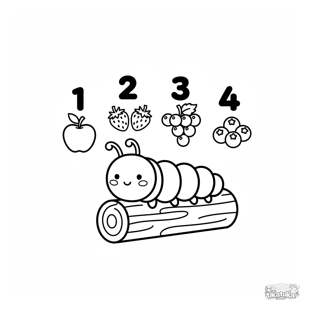 Pädagogisches Ausmalbild für Kleinkinder: Eine fröhliche Raupe hilft, Früchte von eins bis vier zu zählen. Große, einfache Formen.