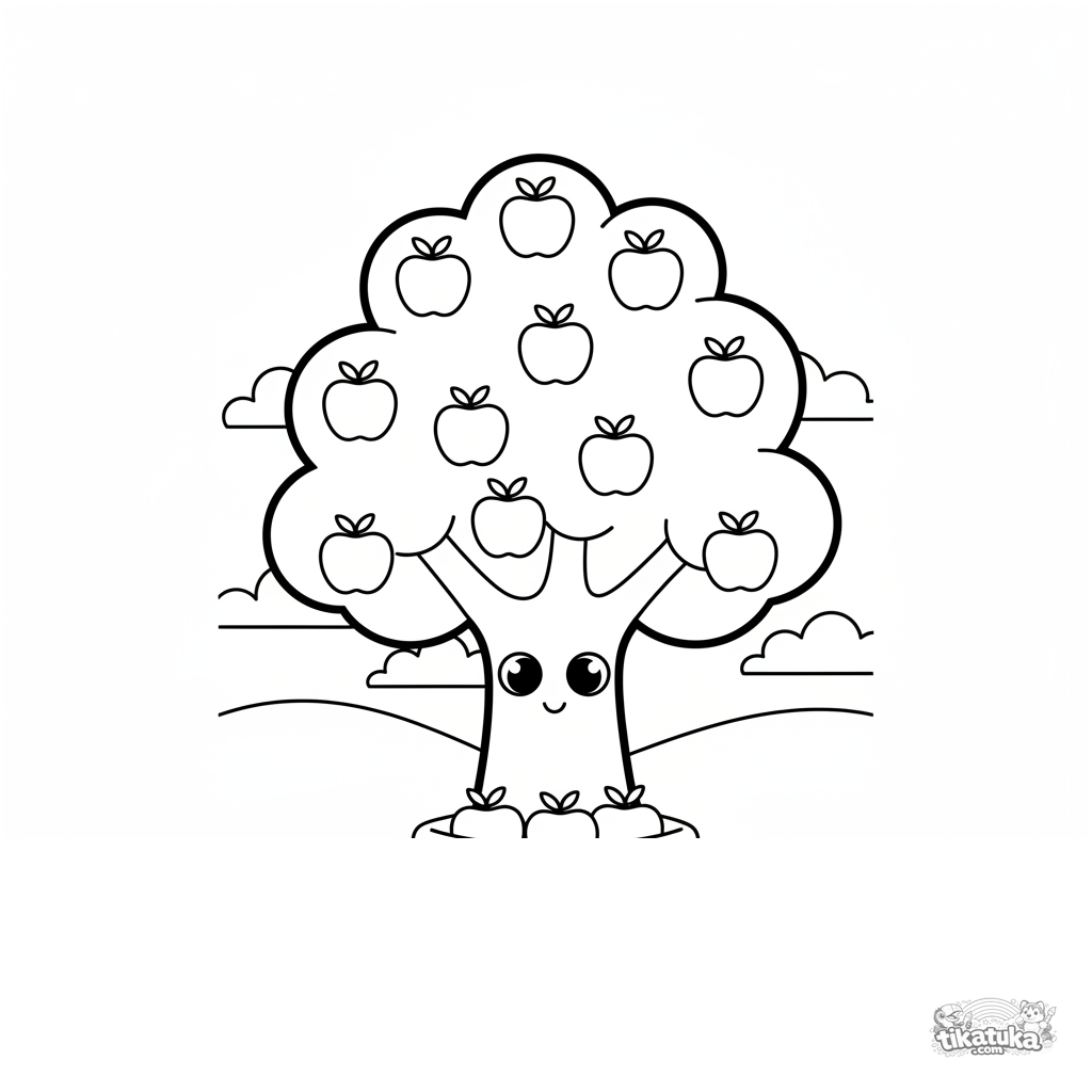 Lehrreiches Ausmalbild für Kinder 4-6: ein Apfelbaum mit zehn Äpfeln und ein Korb mit drei weiteren an der Basis helfen beim Zählen üben.