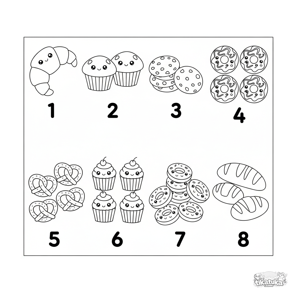 Pädagogisches Sticker-Blatt Ausmalbild für Kleinkinder 2-3: Zähle von 1 bis 8 verschiedene Backwaren. Einfache Formen, klare Zahlen, perfekt für erste Zählübungen.