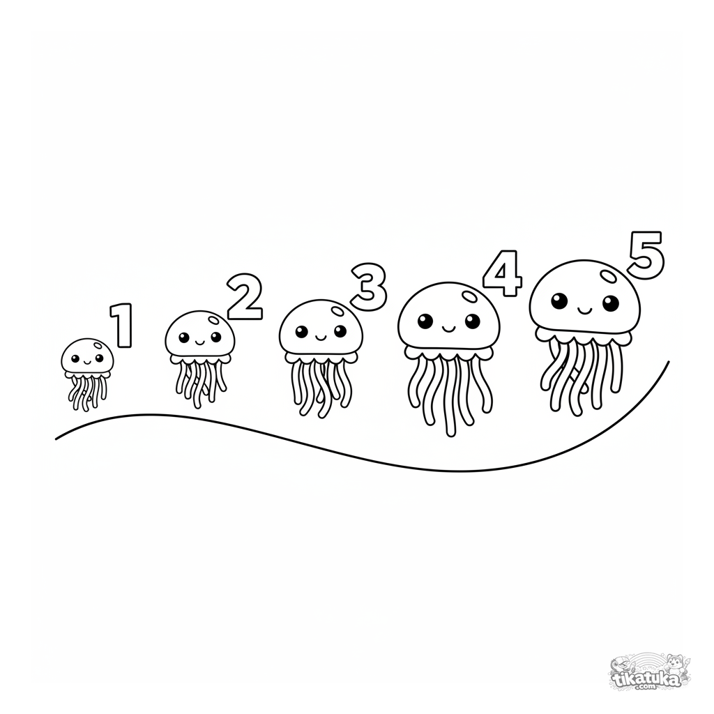 Einfaches Kleinkind-Ausmalbild für 2-3 Jahre: Lerne mit Regenbogenquallen im Meeresstrom zu zählen, große Ziffern von 1 bis 5.