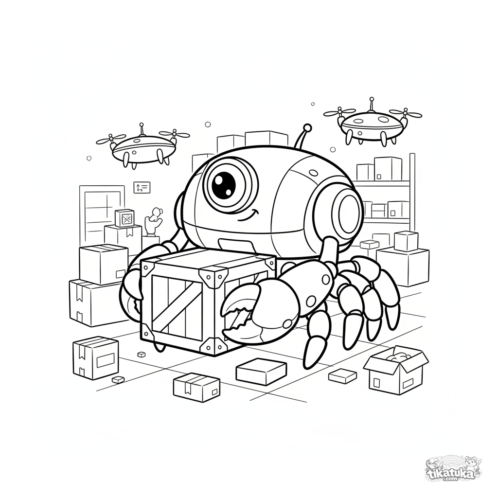 Ausmalbild für 7-9 Jahre: ein gedrungener, krebsartiger Laderoboter trägt eine Kiste über den Lagerhausboden zwischen anderen Kisten und Drohnen.