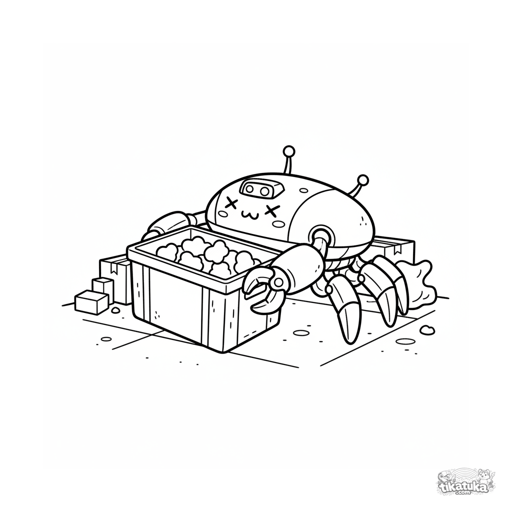 Ausmalbild eines krebsartigen Laderoboters, der eine Kiste in einem Lagerhaus anhebt. Für Kinder von 7 bis 9 Jahren.