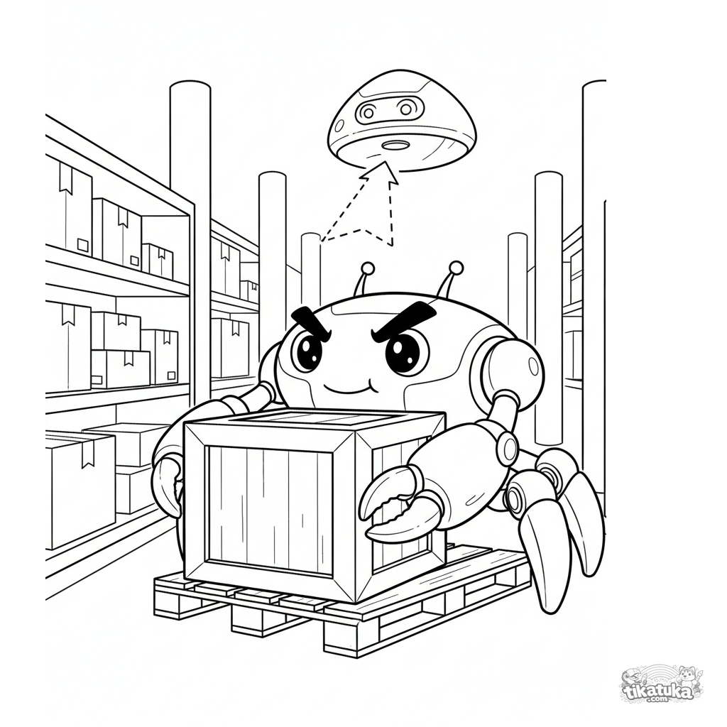 Ausmalbild für Kinder 7-9: Ein kräftiger Krebs-Roboter hebt eine Kiste in einem Lagerhaus mit Drohnenhilfe. Dynamische Szene, klare Formen.