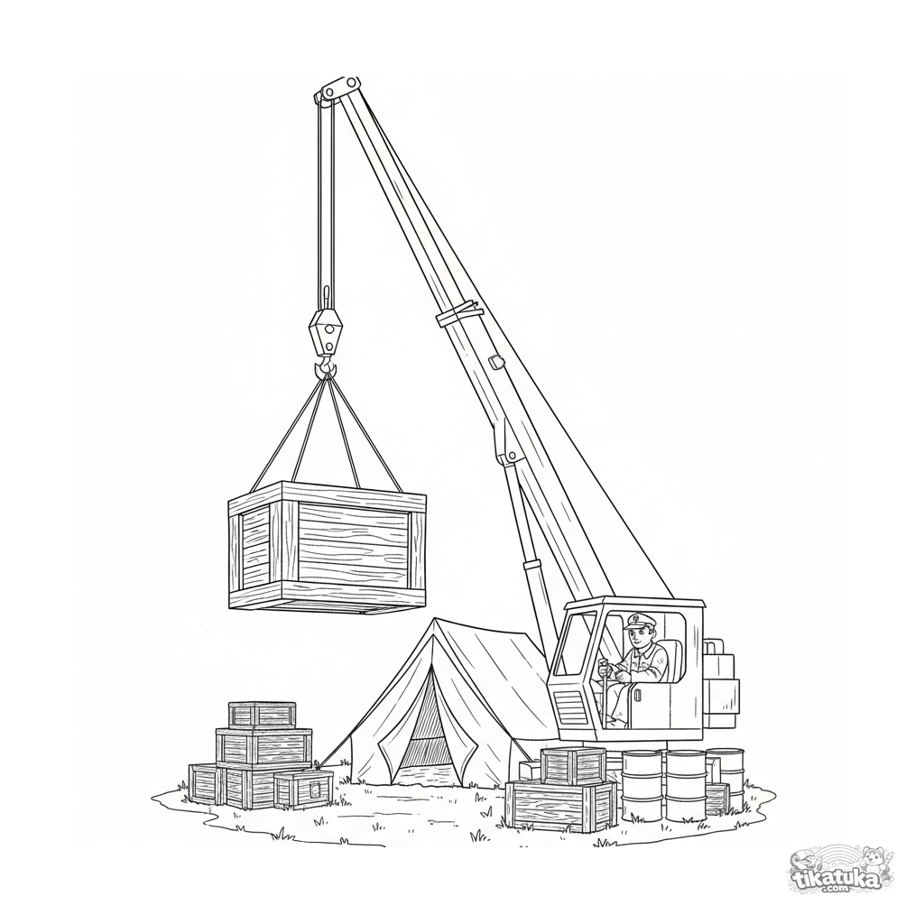 Ausmalbild für ältere Kinder 10-12: Ein detaillierter Militärkran lädt Versorgungskisten in der Nähe von Feldhauptquartierzelten.