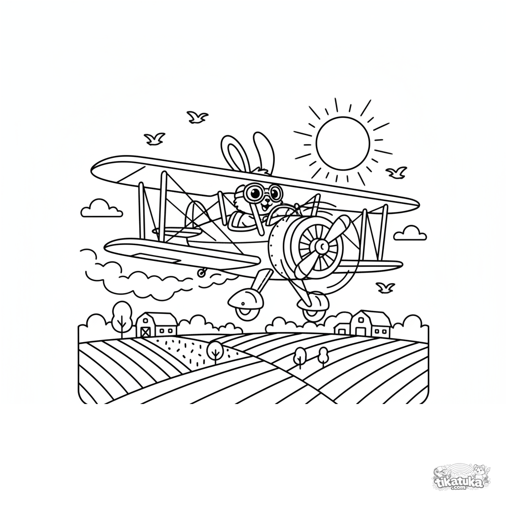 Ausmalbild einer fröhlichen Sprühflugzeug-Biplane, die tief über Feldern fliegt, gesteuert von einem Hasen mit Brille. Für Kinder von 4-6 Jahren, mit klaren Formen.