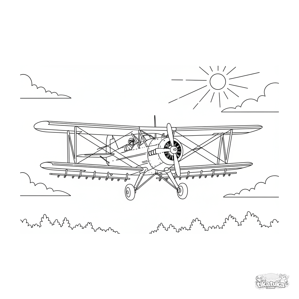Ausmalbild für Kinder 7-9: Ein Sprühflugzeug-Biplane im Flug vor einem malerischen Sonnenuntergangshimmel. Klare Silhouette mit Details.