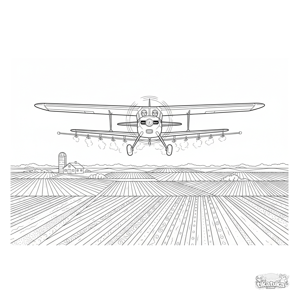 Detailliertes Ausmalbild eines Sprühflugzeugs über Feldern. Für Kinder 10-12. Realistische Umrisse, gemustertes Landschaftsbild, breite Ränder für kreatives Ausmalen.