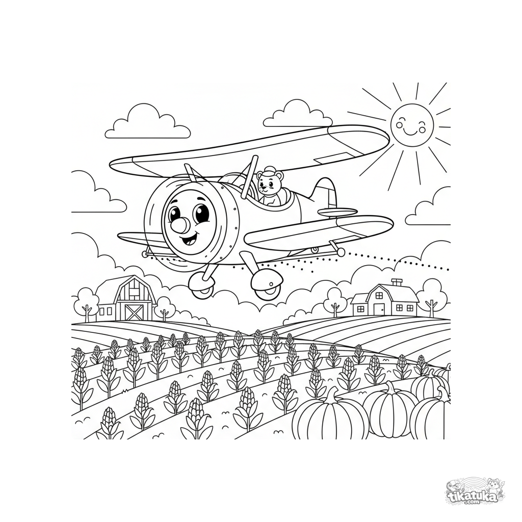 Ausmalbild eines Sprühflugzeugs, das tief über Bauernfeldern fliegt. Für Kinder von 4-6 Jahren. Süße, einfache Szene über landwirtschaftliche Arbeit.