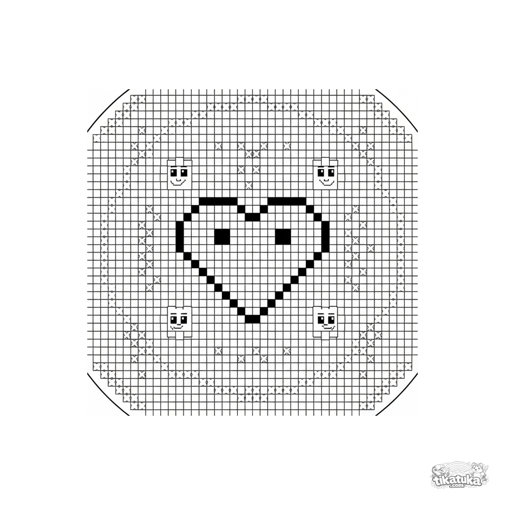 Einzigartiges Kreuzstich-Pixel-Mandala Ausmalbild für Kinder von 10-12 Jahren. Zentrum ist ein Herz, Ringe aus Pixelblumen und Mustern. Rasterbasiertes Ausmalen mit vielen Details.