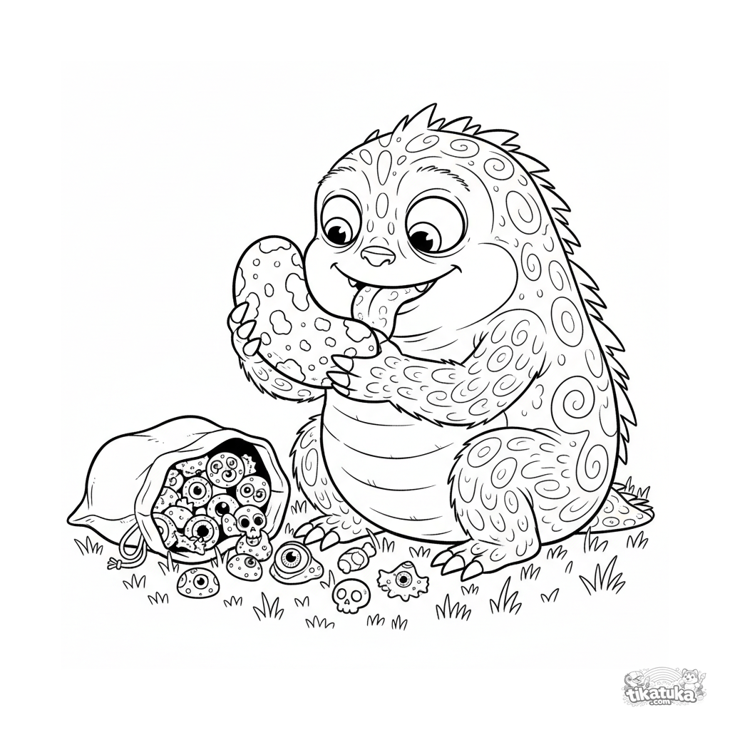 Komplexes Ausmalbild für Kinder 10-12: Ein gedrungenes Monster mit vier Armen untersucht intensiv eine Riesen-Jelly Bean im Gras. Detaillierte Szene mit Textur.