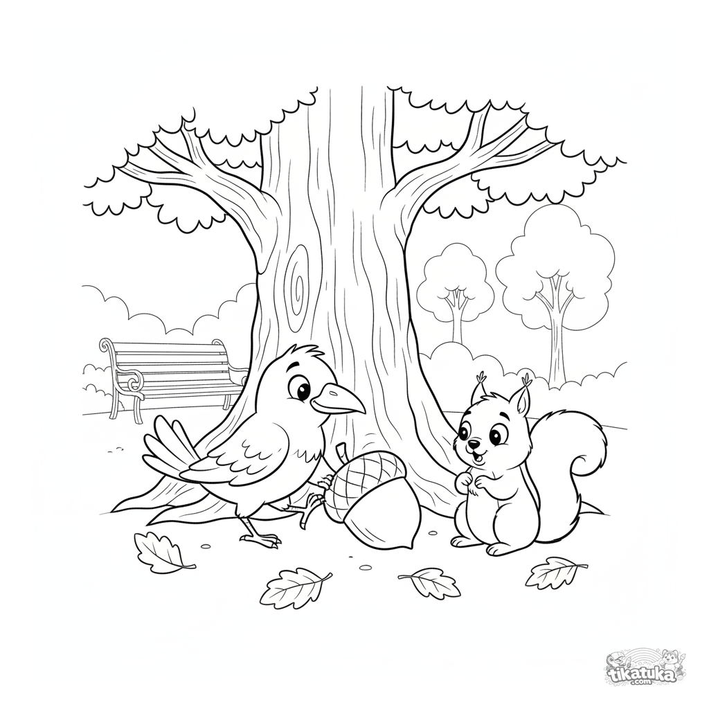 Kinder-Ausmalbild: Eine Krähe im Stadtpark hilft einem Eichhörnchen, eine Eichel zu rollen. Freundliche Tierszene mit detaillierter Eiche und Herbstblättern.
