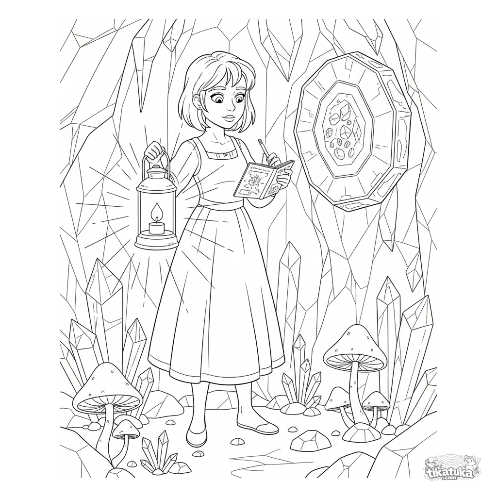 Komplexes Ausmalbild für Mädchen 10-12 Jahre: Eine Forscher-Prinzessin untersucht leuchtende Kristalle in einer Höhle. Viele Details.