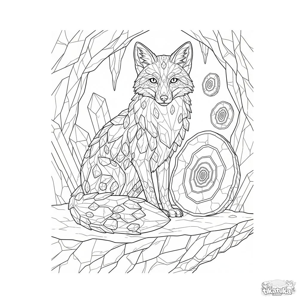 Komplexes Ausmalbild für 10-12 Jahre: ein majestätischer Kristallfuchs bewacht eine Geode in einer funkelnden Höhle. Detaillierte Fantasieszene mit Textur.