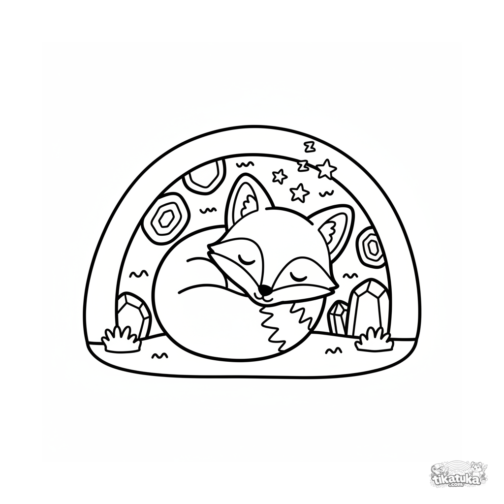 Kleinkind-Ausmalbild 2-3 Jahre: Ein Kristallfuchs-Welpe schläft in einer gemütlichen Höhle. Einfache Fantasieszene.