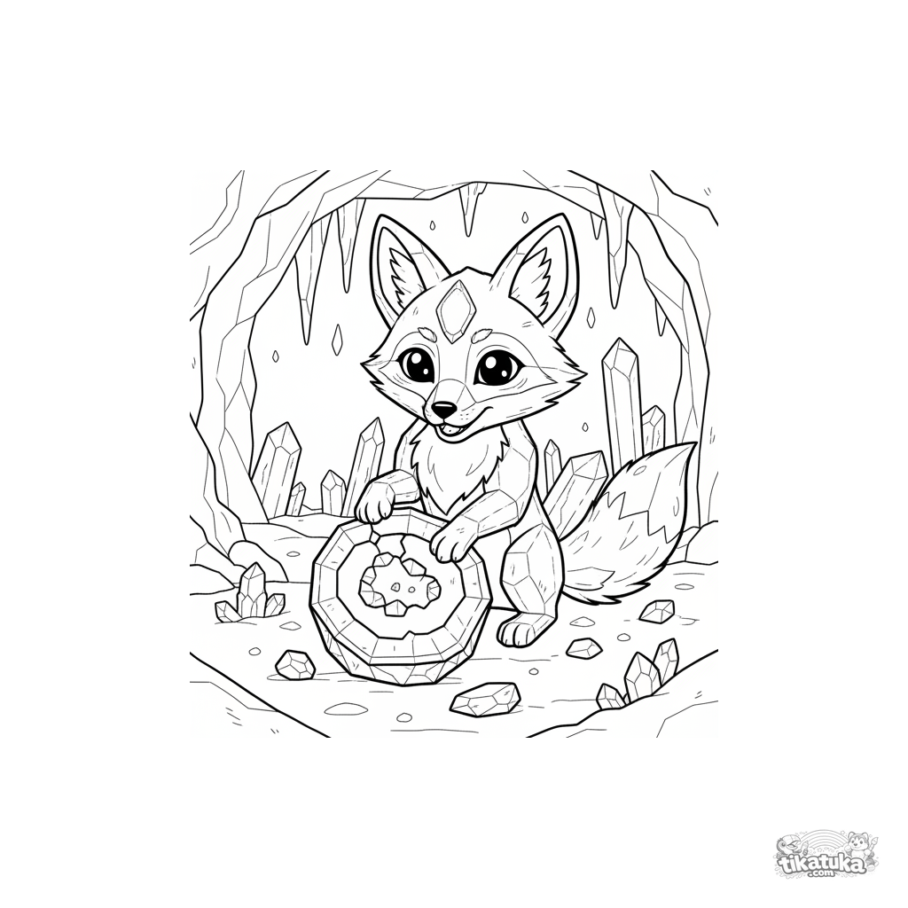 Ausmalbild für Kinder 4-6: Ein Kristallfuchs-Welpe spielt mit einer Geode in einer funkelnden Höhle. Einzigartige Fantasy-Kreatur in magischer Umgebung, klare Umrisse, breite Ränder.