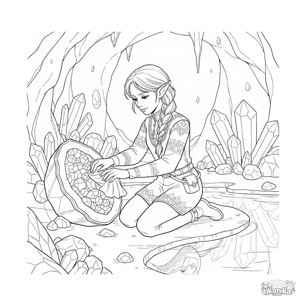 Detailliertes Ausmalbild einer Kristallhüter-Elfe, die eine Geode in einer funkelnden Untergrundgrotte poliert. Für Kinder von 10-12 Jahren.