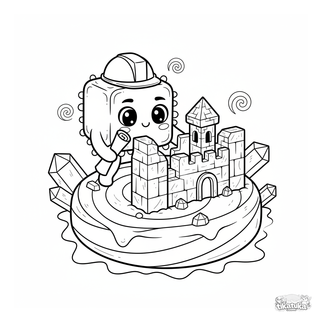 Ausmalbild für Kinder von 4-6 Jahren: Eine würfelförmige Mikrobe mit Helm baut ein Zucker-Schloss auf einem Lollipop. Mäßiges Detail, klare Formen.