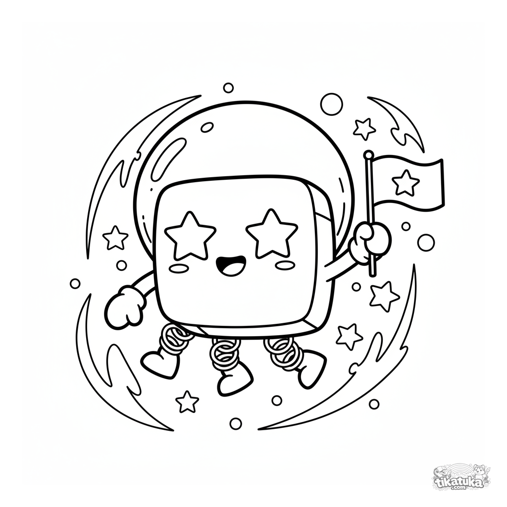 Ausmalbild eines Würfelmikroben-Astronauten, der durch den Comic-Weltraum schwebt. Für Kinder von 4-6 Jahren. Heller Anime-Stil, einfache Formen.