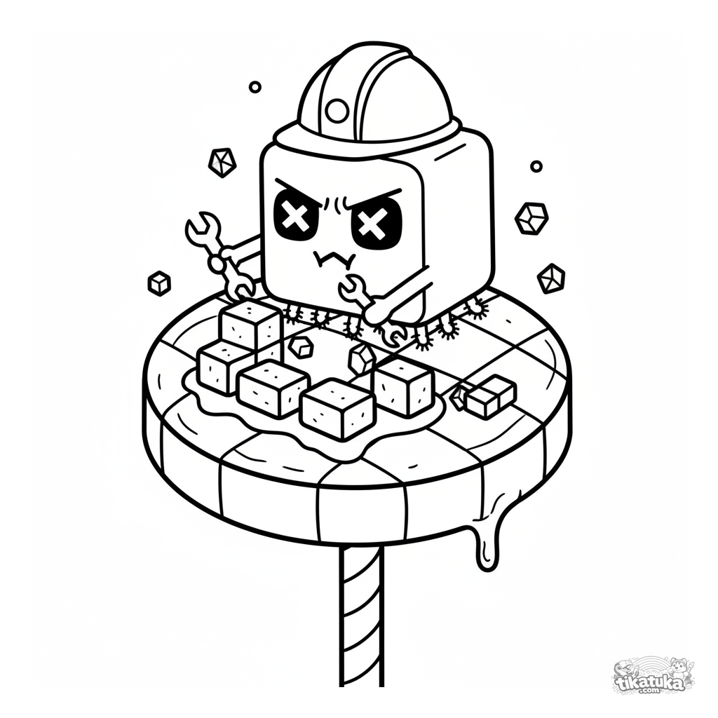 Ausmalbild für Kinder 7-9: Eine würfelförmige Mikrobe mit Helm baut ein Haus aus Zuckersteinen auf einem karierten Lutscher. Geometrische Szene.