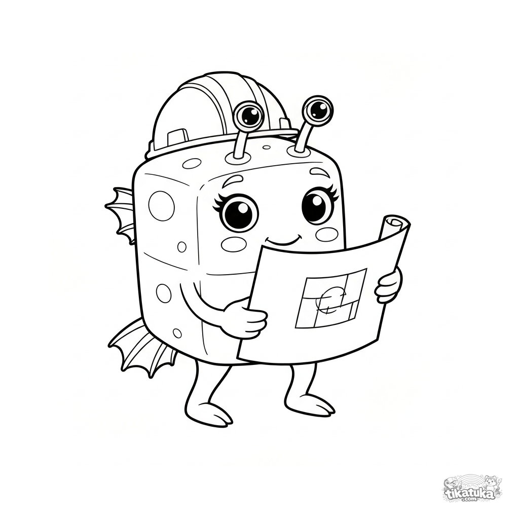 Ausmalbild für Kinder. Würfelförmige Mikrobe als Baumeister mit Helm, Bauplan, Flossen und Krabbenaugen. Kostenlos herunterladen.