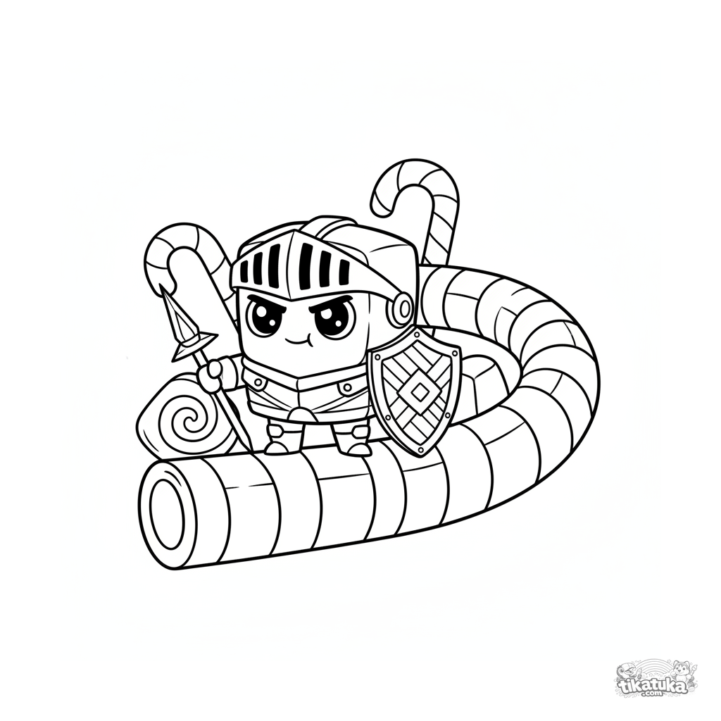 Ausmalbild für Kinder 7-9: eine würfelförmige Mikrobe als Ritter mit Lanze und Schild auf einer burgenartigen Lollipop-Oberfläche. Eine Fantasy-Abenteuerszene.