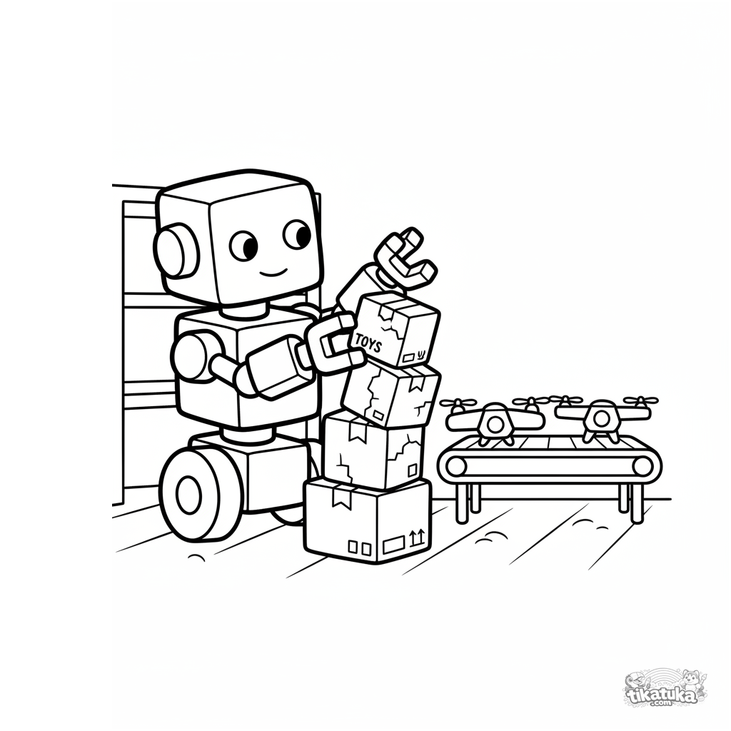 Kleinkind-Ausmalbild 2-3 Jahre: Ein einfacher würfelförmiger Roboter baut einen Turm aus kleinen Kisten in einem Lagerhaus. Große Formen, breite Ränder zum Ausmalen.