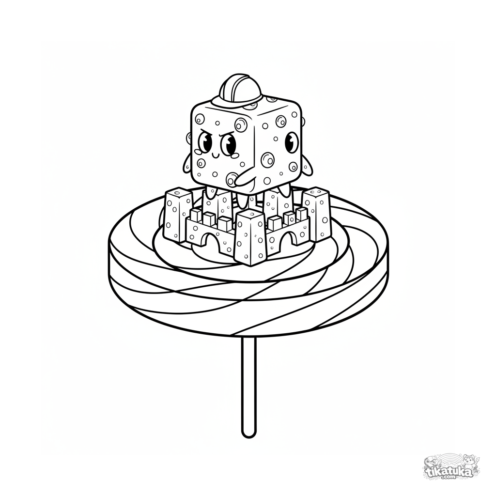 Detailliertes Ausmalbild für ältere Kinder 10-12: Ein kubischer Mikrobe mit Helm baut eine Burg aus Zuckersteinen auf einem Riesen-Lollipop. Geometrische Formen, interessante Details.