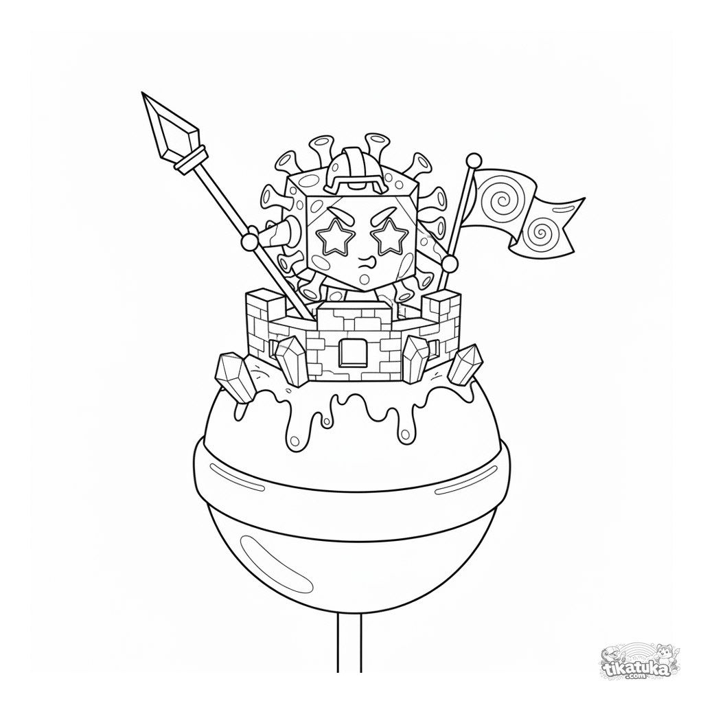 Komplexes Ausmalbild für Kinder von 10-12 Jahren: Ein kubischer Virus-Ritter bewacht eine Zuckerburg auf einem Lollipop. Ein detailliertes Bild im geometrischen Stil.