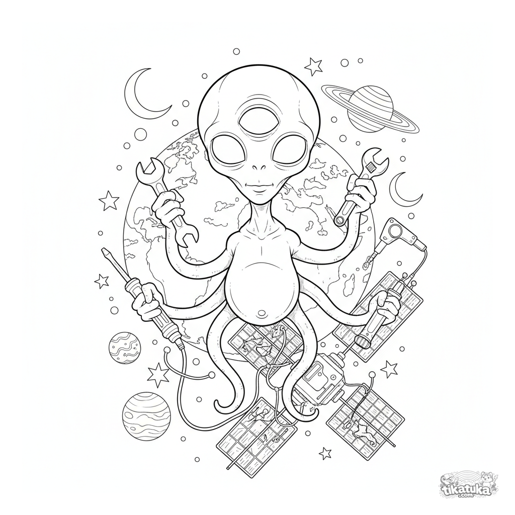 Detailliertes Weltraum-Ausmalbild: Ein neugieriges Alien mit Tentakeln repariert einen Satelliten in der Erdumlaufbahn. Für 7-12 Jahre.