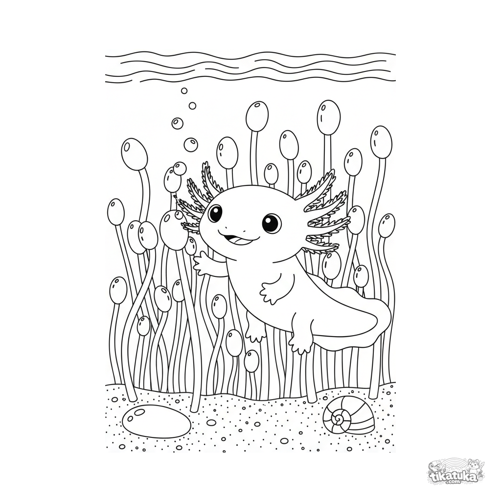 Ausmalbild für Kinder 4-6: ein süßer Axolotl erkundet leuchtende Unterwasserpflanzen. Magische Unterwasserszene mit Blasen.