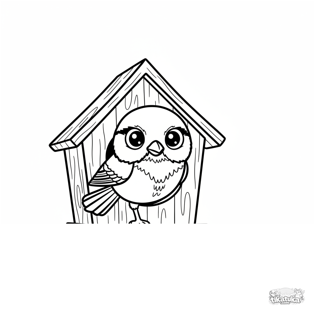 Einfaches Ausmalbild für Kleinkinder 2-3: eine niedliche Blaumeise mit großen Augen lugt aus dem runden Loch eines Holz-Vogelhauses. Große, klare Formen.