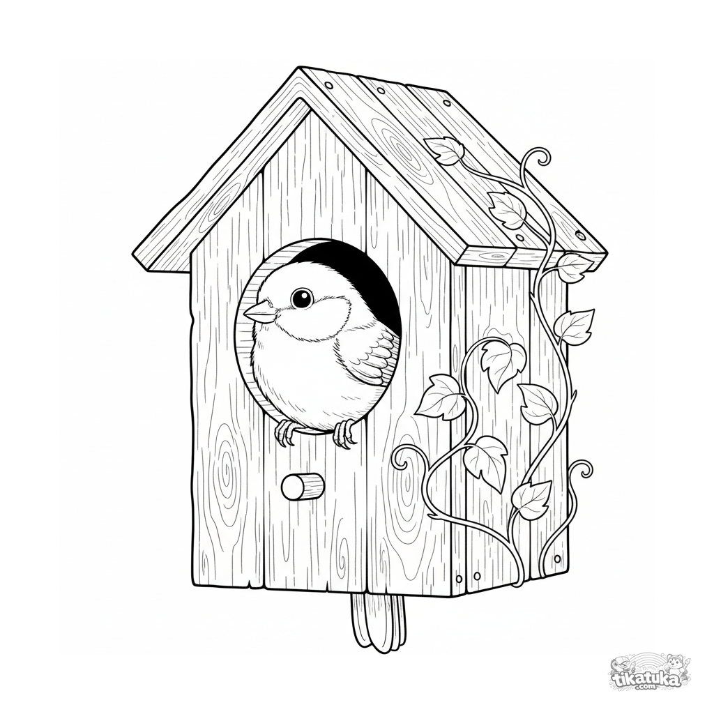 Detailliertes Ausmalbild für 10-12 Jahre: eine Blaumeise mit hellem Gefieder lugt aus einem runden Fenster eines Holz-Vogelhauses. Realistischer Feldhandbuch-Stil mit klaren Umrissen.