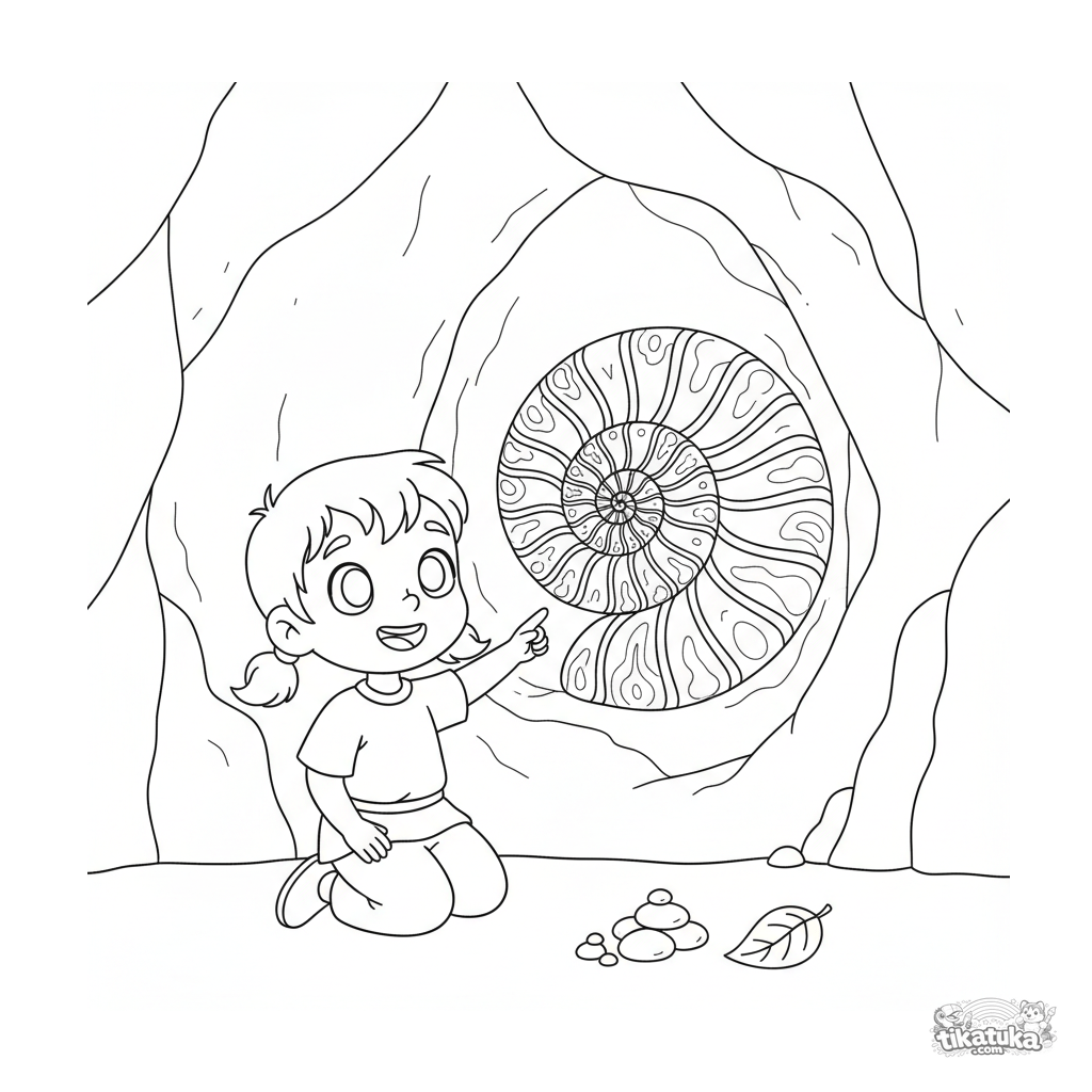 Ausmalbild für Kinder 4-6: Ein neugieriges Kind entdeckt ein Fossil in der Wand der Gorgonenhöhle.