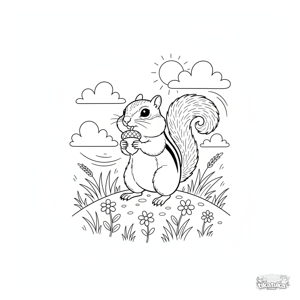 Ausmalbild eines neugierigen Streifenhörnchens auf einem windigen Hügel. Für Kinder von 4-6 Jahren. Realistischer Stil mit Naturdetails.