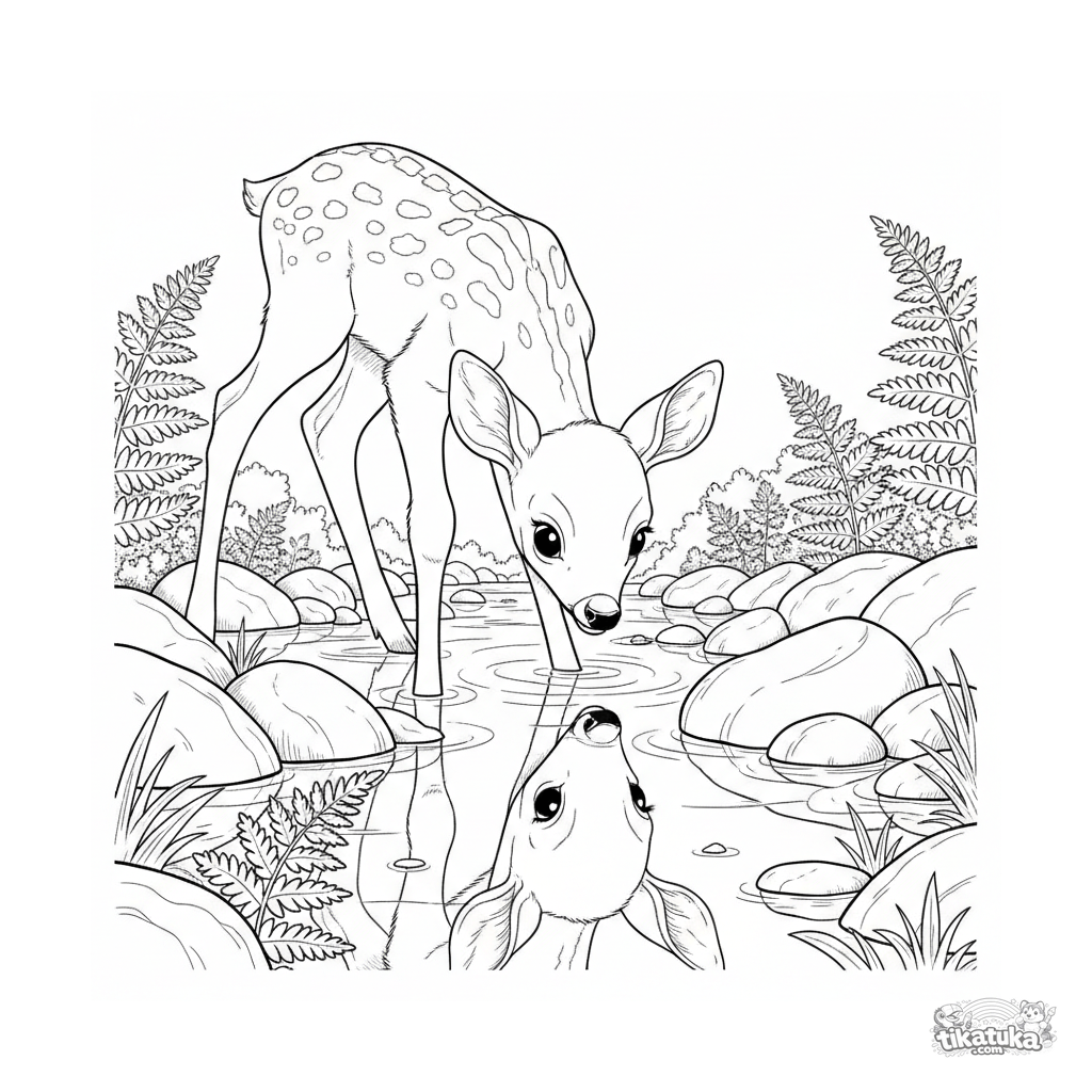Ausmalbild für Kinder 7-9: Ein neugieriges Rehkitz trinkt Wasser aus einem klaren Waldbach, umgeben von Farnen und Steinen.