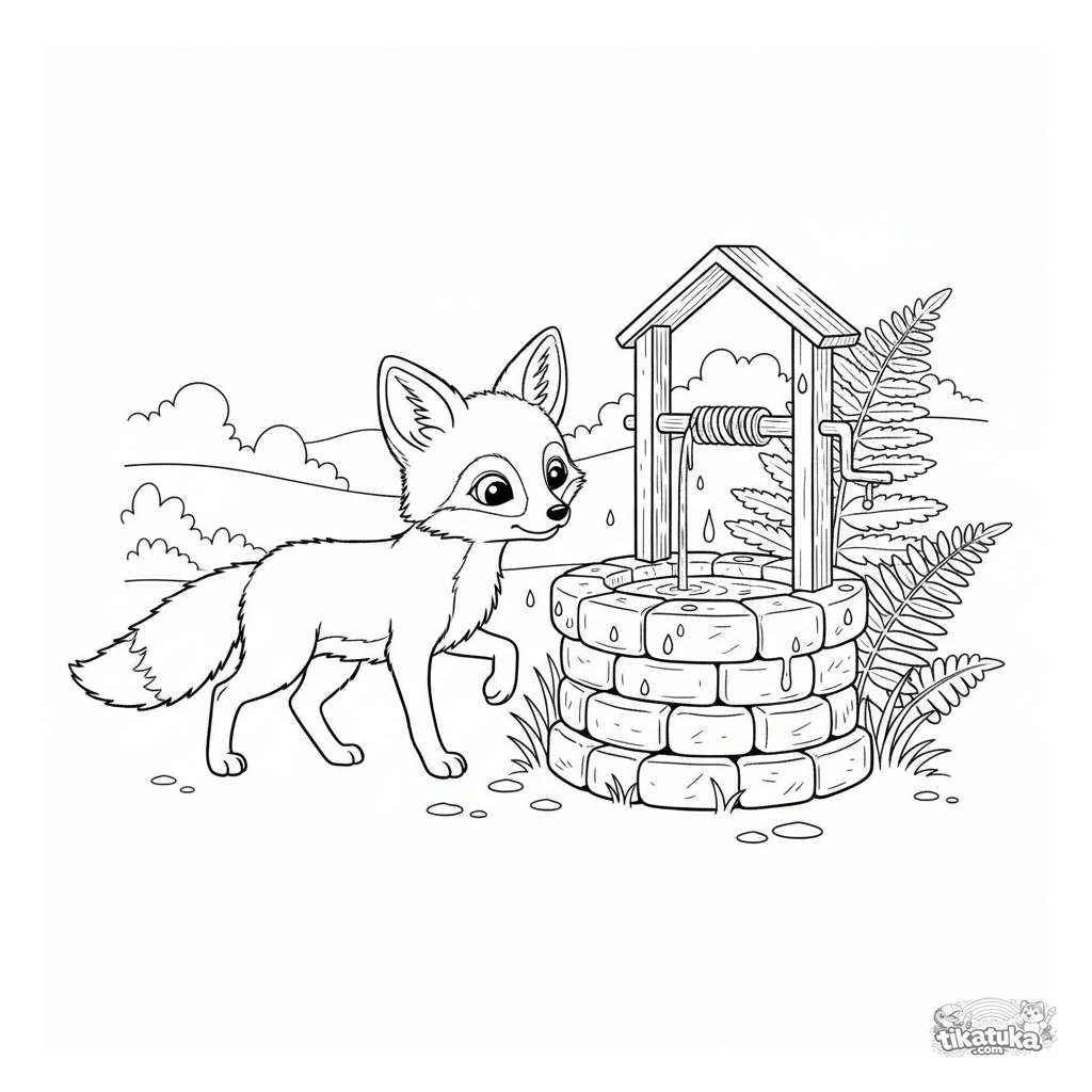 Ausmalbild für Kinder 7-9: Ein vorsichtiges Fuchsjunges nähert sich dem Brunnen des lebendigen Wassers auf einem Waldpfad. Szene im Vintage-Stich-Stil.
