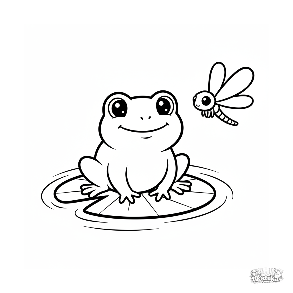 Einfaches Ausmalbild für Kleinkinder 2-3: ein Frosch sitzt auf einem Seerosenblatt in einem Bach. Große klare Formen, wenige Details.