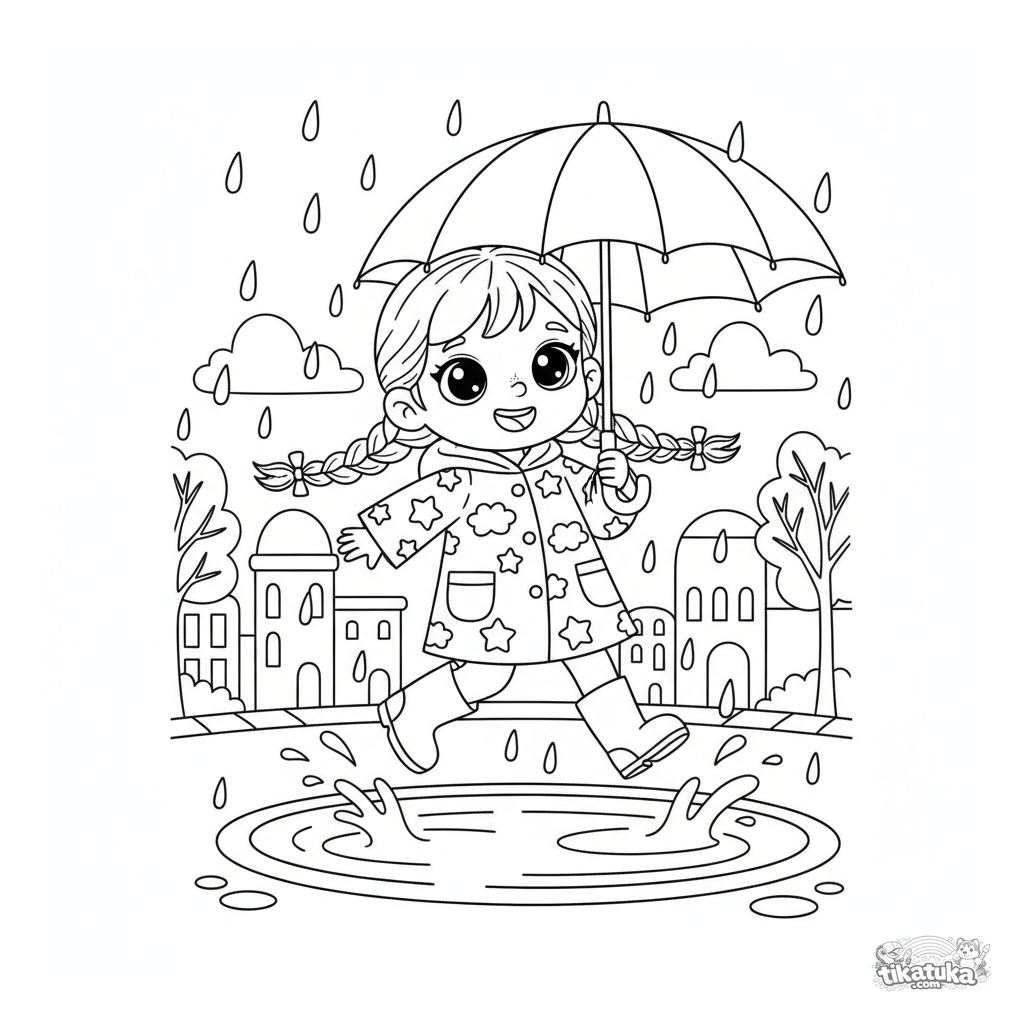 Ausmalbild eines fröhlichen Mädchens im Regenmantel, das in einer Pfütze unter einem Regenschirm hüpft. Für Kinder von 4 bis 6 Jahren.