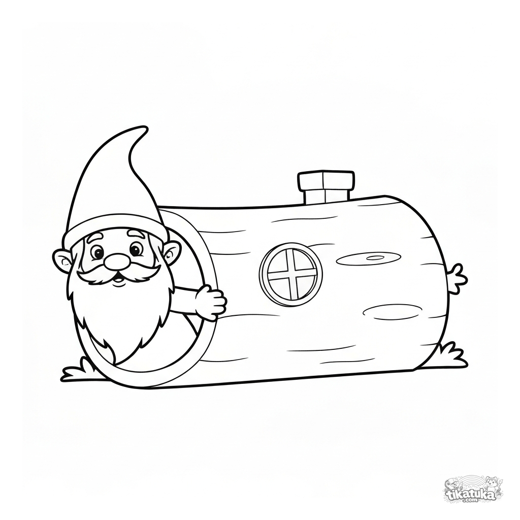 Ausmalbild für Kleinkinder: ein neugieriger Gnom lugt aus der runden Tür seines Hauses in einem hohlen Baumstamm. Einfache, niedliche Szene für 2-4 Jahre.