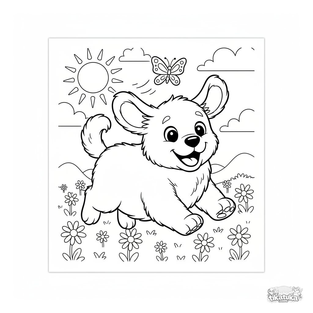 Ausmalbild für Kinder 4-6: ein neugieriger Golden Retriever Welpe jagt glücklich einen Schmetterling auf einer sonnigen Wiese. Einfache Formen und süßer Gesichtsausdruck.