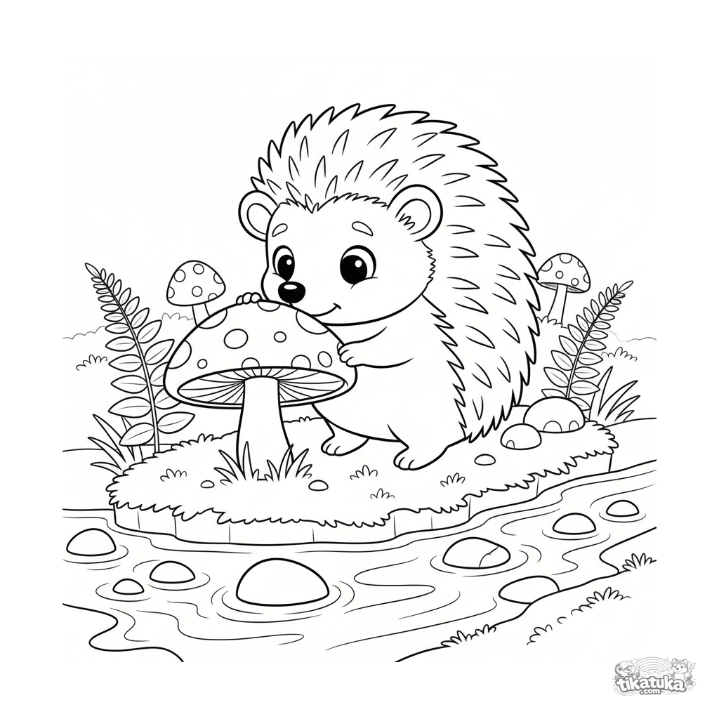 Ausmalbild für Kinder 4-6: Ein neugieriger Igel am Ufer eines klaren Baches untersucht einen großen Pilz. Eine niedliche Herbstnatur-Szene mit Farnen und Kieselsteinen.