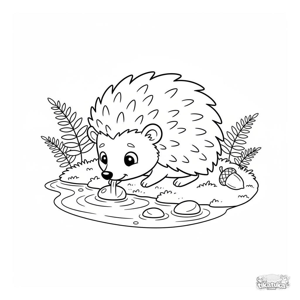 Ausmalbild für Kinder 4-6: Ein süßer Igel trinkt Wasser von einem klaren Waldbach an einem moosigen Ufer. Einfache Formen, klare Szene.